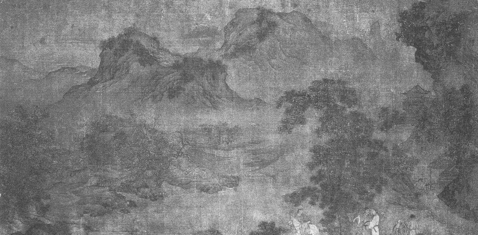 此图绢本青绿画法已融入较多的水墨笔意。峰峦、山头、石坡、岸堤笔骨粗重,在外廓勾勒基础上以湿笔带水烘染,间以似斧劈间短披麻皴笔,以线面相协来构成画面大的黑白视觉效应,纵深远水土坡皆水墨没骨渲染。水面、远山一抹简洁明快。山头墨点植被似苔似小树丛,画法也渐趋活泼简率,表现出元风。