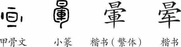 “晕”是形声字。甲骨文中日周围是光晕。小篆另加声符“軍”。隶变后楷书写作“暈”。汉字简化后写作“晕”。