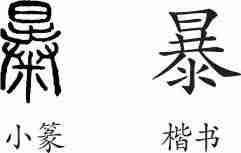“暴”是会意字。小篆从日,从出,从廾(双手),从米,会日出时手拨米而晒之意。隶变后楷书写作“暴”。