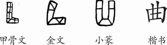 “曲”是象形字。甲骨文像一个弯曲的东西,中间有纹饰。金文与甲骨文类似。小篆像能装东西的器物之形。隶变后楷书写作“曲”。