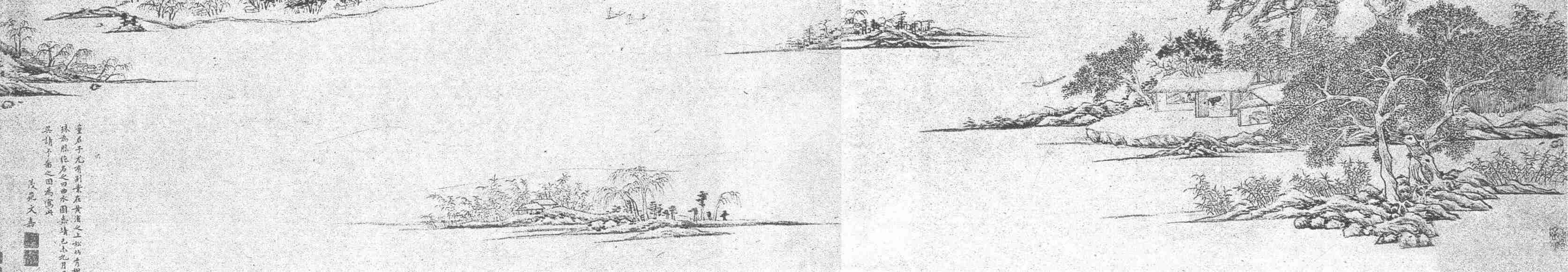 此图右方为一畴平岸,近河筑茅屋三间,屋舍四围茂木藂林,长松挺秀,修竹深密。隔河下方有坡石葭苇,古柏阴翳。画幅中部为一大片空濛的水域,河中坐落几处汀屿,点缀柳竹屋舍,至卷末微露坡岸的一隅。画面形象地写出了黄浦畔曲水绕村的景色。图上的景色便是当时江畔水乡的真实写照,那辽阔的江面应该就是黄浦了。画家所称“松竹秀郁,殊为胜绝,”正是赞美其地居水滨,有自然朴质之美,而这与主人“守拙心弥敦”的澹泊人格是互为表里的。图中正屋里有一人踞坐草褥展卷而读,想必为曲水园主人董宜阳了。右屋内侍童正在端奉茶杯,邻屋桌上置放书册,陈设简朴雅洁,把主人怀抱贞素、读书自乐的心境很好地衬映了出来。此外竹林小径尚有策杖来客,傍岸孤舟有人坐钓,他们都是主人“不事机关与世违”的“忘机友”(文嘉题语),在这僻静的水乡幽境里,共同觅得一块“只知身世常闲逸,不道人间有是非”(卷后潘德元题语)的乐土。