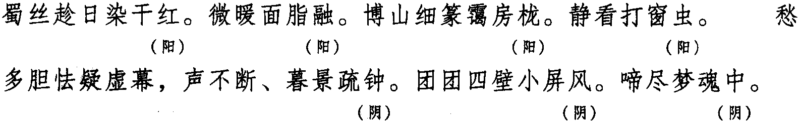 本格双片五十字。全词同韵,平韵,韵字可阴平、可阳平。
