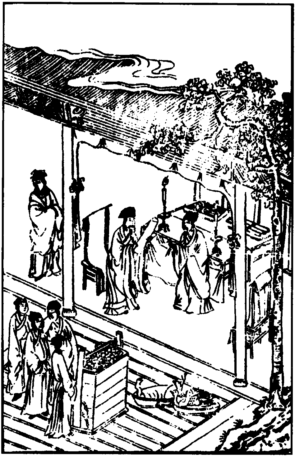 【前腔】 云雨断空斋,我热心担,冷面挨,怎教识破连环寨。(内打五更介)(生)呀,好了。听得更锣骤筛,又见落月堕阶。(内鸡鸣介) (生) 乱鸡咿喔想天明快。(出步介) 只得转苍苔,三千弱水,做个咫尺隐蓬莱。