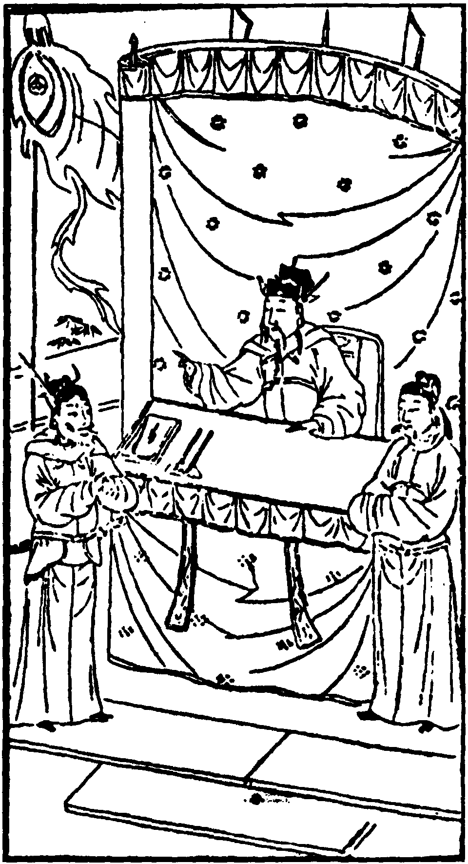 【新水令】 (生)杀气峥嵘,犹如半空展翅。挤困扶危,扫除奸弊,俯仰乾坤无愧。执掌山寨乐无忧,鏖战江湖数十秋,苍天若遂男儿志,一统山河万万秋。小将乃宋江是也。只是蔡疙瘩这厮,强占人妻,前者差杨雄下山擒拿,不能战胜。左右!传令与三十六大营,七十二小营,有能擒得蔡疙瘩者,上堂听令!