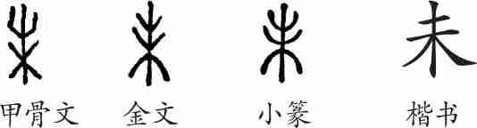 “未”是象形字。甲骨文像一棵枝干繁茂的树木的样子。金文大致相同,小篆整齐化。隶变后楷书写作“未”。