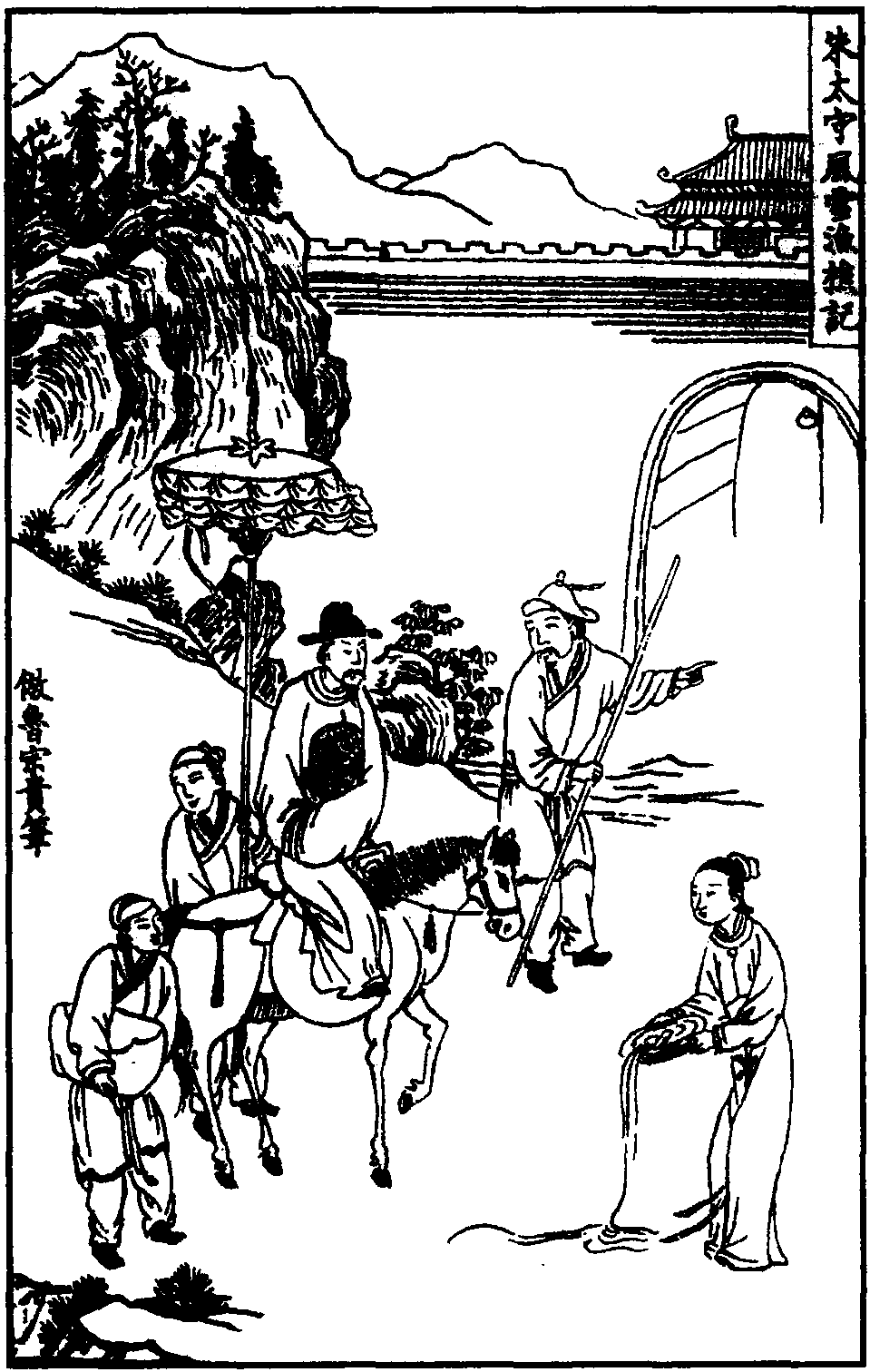 朱买臣事见 《汉书·朱买臣传》。这是个贫士发迹的故事,据 《汉书》载,买臣久贫寒,其妻不耐饥寒,离异再嫁。后买臣得官,为会稽太守,衣锦还乡。道遇前妻及其再嫁丈夫,接至太守府,置园中,给饮食。居一月,妻自经死。元杂剧据此历史故事改编,却改为团圆结局。是说朱妻受命于父,要激励买臣上进,故意索取休书,暗中资助他上京求取功名。朱得官后,知道此种情由,与妻团圆。然而,这一故事的警戒意义在于批评嫌贫背义。因而关于朱买臣被迫休妻,做官后妻欲再续婚姻而遭拒绝的故事,流传甚广,尤其朱买臣马前泼水、覆水难收的情节,脍炙人口,清传奇《烂柯山》 即是此情节,其结局是妻投河死。元剧又有 《王鼎臣风雪渔樵记》,与此剧无大差异,学者们以为是明代人为避朱家王朝之讳,改此剧名。