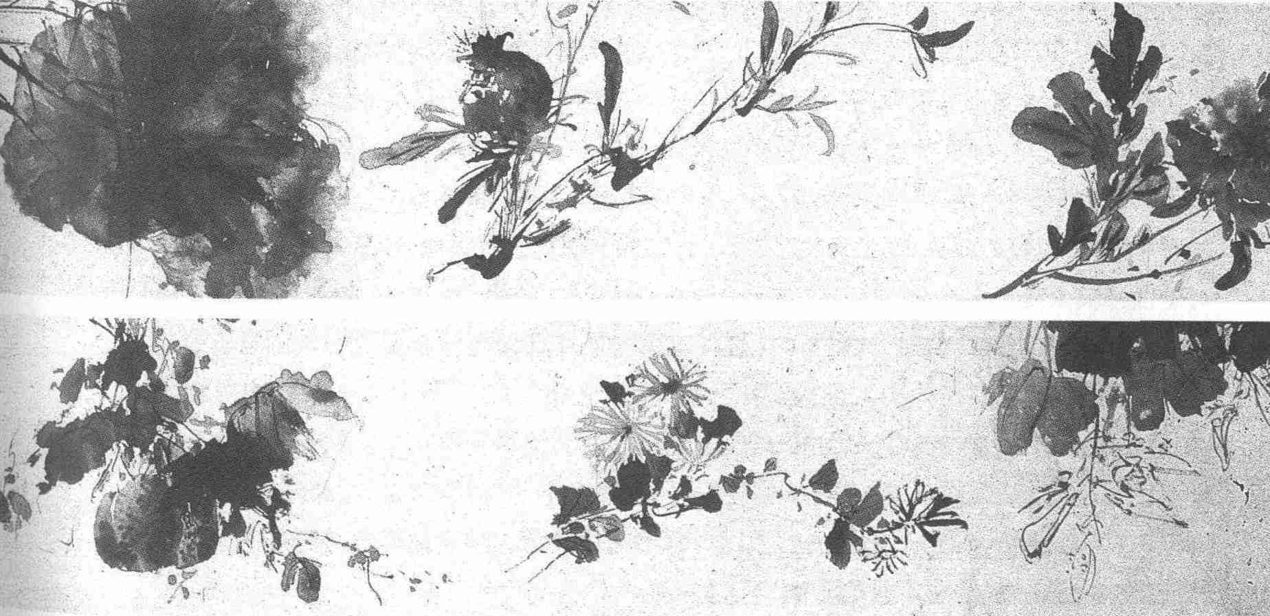 《杂花图》纸连十幅,作水墨花木十三种,分别为牡丹、石榴、荷花、梧桐、菊花、瓜、豆、紫薇、葡萄、芭蕉、梅花、水仙、竹。打破自然时空的限制,撷四时之精英,集万里于一图,其落想本身便充溢着强烈的表现性意味,突出了主观思想情感对于绘画对象的支配地位。那纵横捭阖,随意挥写,洋洋洒洒,一气呵成的磅礴气势和开阔境界,更是追求个性解放的形象化体现。丰润的牡丹,饱满的榴实,淋漓的莲叶,孤傲的霜菊,挺洁的寒梅,种种画面形象所焕发的笔情墨趣,有轻有重,有刚有柔,有枯有润,有虚有实,穷尽变化,涉处成章。舒展九尺的桐枝和五尺的蕉叶,直冲画外,不见首尾,则如虹贯天,如水行地,收到了振兴全局、涵泳细节之功。居于画卷中段而稍偏后的葡萄,黛叶翻飞垂云雨,老藤腾空如玄龙,颗颗明珠,脉脉新蔓,纷纷攘攘,风驰电掣,形成了一个高潮,一个热点。这横长数丈的巨构,是墨的世界、笔的天地、情感的海洋!勾、斫、点、垛、泼、破、醒、化、喜、怒、忧、愤、怨、悱……数不尽的点和线、形和色、灵和肉,在其中啸傲徘徊、奔腾踊跃,或如骇浪,或如烈火,或如轻云,或如堕石,有力量的冲突,有声音的交响,更是血和生命的进发!