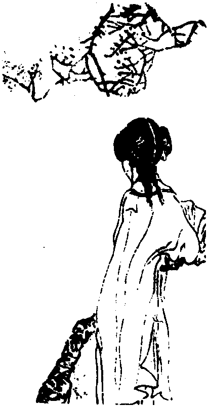 下阕描写少女乍见来客的动作情态,妙在曲折多变。首句遂来一转折: 她荡完秋千,正累得不愿动弹时,突然花园里闯进来一个陌生人,她感到惊诧。二、三句说少女来不及穿上脱在地上的鞋,急忙含羞跑开。脚上仅仅穿着袜子,头上的头发散乱,连金钗也滑落到了地上。这便传神地刻画出了少女匆忙遑遽,来不及整理衣装,急忙回避的情态。作者并未正面描写这位 “不速之客” 是谁,但从少女的反应中可以印证,这是一位举止不凡、风度潇洒的翩翩少年。刚才还荡毕秋千,懒得动弹,蓦地来了客,她却弃履掉钗,逃得飞快。她哪来的气力? 只因羞于给他瞧见自己松松散散的模样,只因她但愿在他心目中永远端庄大方。“和羞走” 一句,把少女此时此刻的内心感情和外部动作作了精当的描绘。然而更妙的是结尾两句,作者以极其精湛的笔墨描出了少女怕见又想见、想见又不敢放胆去见的微妙而又细致的心理。最后,她还是利用尚未走进屋内的机会,伏在门框上以 “嗅青梅” 的假动作来掩饰自己,以便偷偷地看上那少年几眼。“倚门” 已是有所准备和期待,“回首嗅青梅” 则描尽了矫饰之态,鼻子在“嗅” 眼睛却在 “看”。整个下阕都是写 “动”,与上阕正好形成了对比。由此可见,上阕的 “静” 不仅静中见动,同时也是为了衬托下阕的 “动”。而下阕的 “动” 所写的几个动作则层次分明,分别将少女惊诧、惶遽、含羞、好奇以及爱恋、多情的心理活动,栩栩如生地刻画了出来。