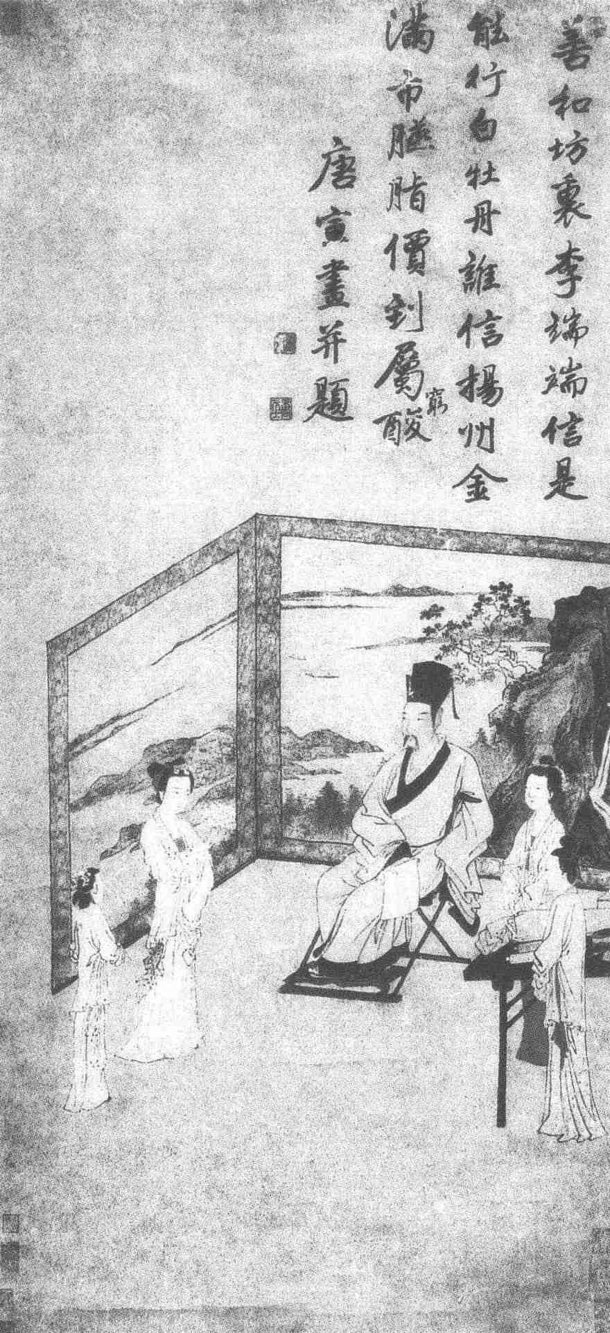 图上画着五人,居中坐着一戴文生巾(帽)、留八字须的书生,其面部神情和倚坐姿态,无不显示出潇洒、儒雅的气度和风采。近靠主人左侧站在黑书桌两边的是其婢女,一着红色套裙,一着白色衫裙,色彩对比鲜明、有层次感。站在主人右前的是来客——手持一朵白牡丹的小姐,姿态文雅,楚楚动人,身后是随从侍女。四女围着主人,左右上下排列错落有致,宛如众星拱月似的烘托了主人的重要形象和地位,这是此画构图的特色。人物背景是山水大屏风,上方题着:“善和坊里李端端,信是能行白牡丹。谁信扬州金满市,胭脂价到属穷酸。”点明图中持白牡丹者即扬州名妓李端端,当中书生乃是唐代诗人、久居扬州的崔涯,唐寅即以他俩间的故事来立意作画的。