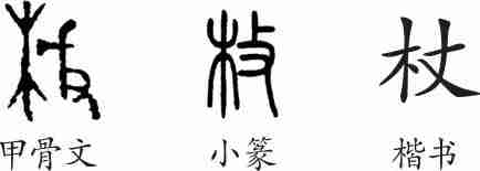 “杖”是会意兼形声字。小篆从木(表示与树有关)从丈会意,丈兼表声。隶变后楷书写作“杖”。