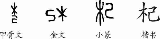 “杞”是形声字。甲骨文从木,己声。金文改为左“己”右“木”。小篆的结构位置固定了下来,并规范化。隶变后楷书写作“杞”。