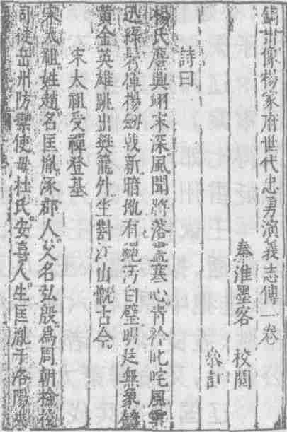 明代白话长篇英雄传奇小说。一名《杨家将演义》、《杨家通俗演义》、《杨家府演义》,又名《杨家将》。八卷五十八回。题“秦淮墨客校阅,烟波钓叟参订”。秦淮墨客即纪振伦,字春华,江宁(今江苏南京)人。成书于明万历年间。