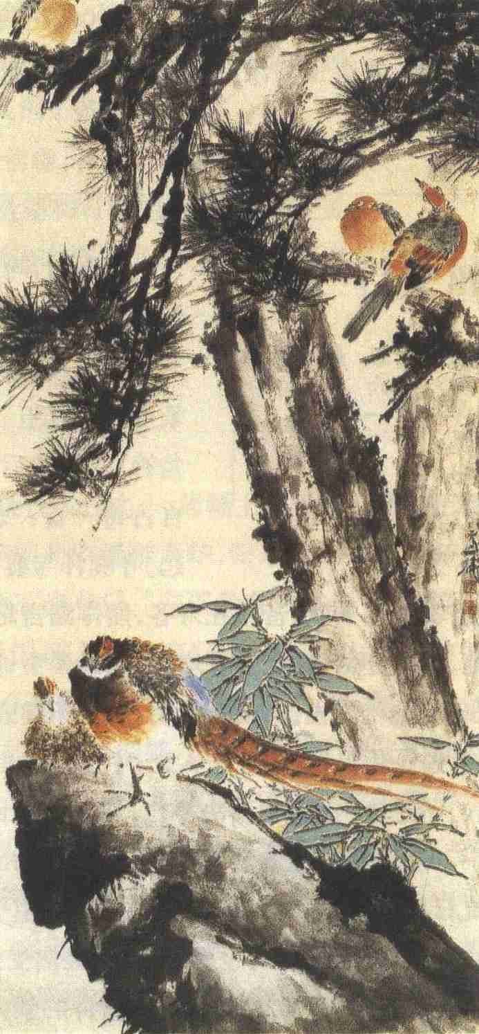 《松阴栖禽图》的主角是一对锦雉,锦雉美丽的羽毛和复杂的结构,为工笔重彩提供了用武之地,是水墨大写意的禁区。王雪涛散逸的笔法,画出了工笔重彩的效果,他以赭石、朱砂、藤黄、石青以及铅粉等色,和墨色相融,产生了五彩斑斓的感觉,亮丽又不轻佻,运笔收放有度,始终控制在不工不狂的中间状态,温文尔雅,既得形似,又现笔情墨(色)趣;松枝上的三只禽鸟,用了同样的方法,但略略从简,以示主次有分。松树和石块的笔法较为放逸,大笔阔墨,但笔墨的势态中和稳健,加上双钩填色的丛竹,背景与主角关系的处理,十分得当。背景的松石,水墨为主体,少量的花青掺杂其中,如此水墨环境里的斑斓多彩的禽鸟,有相得益彰的功效。一是使斑斓多彩的禽鸟更加出色,这是对比和衬托的方法;二是用水墨来减去禽鸟因斑斓多彩而可能产生的媚俗之态,使画面尽可能地雅化。更绝妙的是,画家刻意安排了双钩填色的丛竹,既在色彩上弱化双雉,又造成松石和禽鸟的画法上的缓冲区域,使整个画面在各自为政中产生连带关系,从而达到统一与和谐。