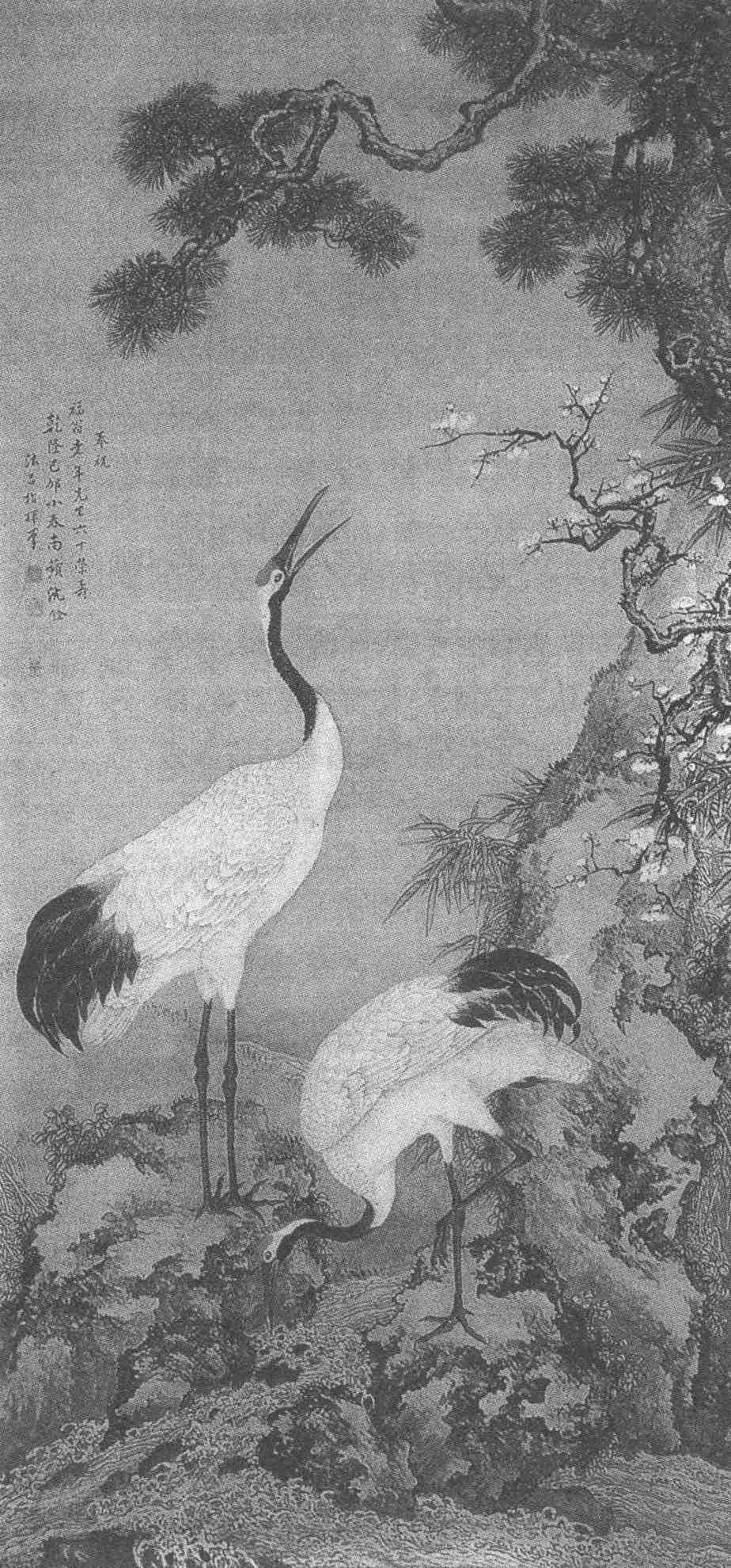 在中国传统文化中,松树和仙鹤都是长寿的象征,所以此类画幅大都是作为向“寿星”祝贺生日时的礼品而画的。曾经有一位动物学家,专门为文,讲述鹤类的生活习性,说它们虽然是候鸟,需要飞行迁徙,但是在陆地上主要的生活环境是“湿地”(即水草食物丰沛的沼泽地)。仙鹤从来不在松树上栖息。很显然画家将松树和仙鹤“拉”在一起,画在同一个画面内,并非是“写实”的手法(虽然绘画风格可以是十分“写实”的),这类作品,体现和反映的不是生物界的自然状态,而是中国文化的人文状态。所以从严格而非绘画技法的意义上来讲,这幅作品同样也是属于“写意”画。