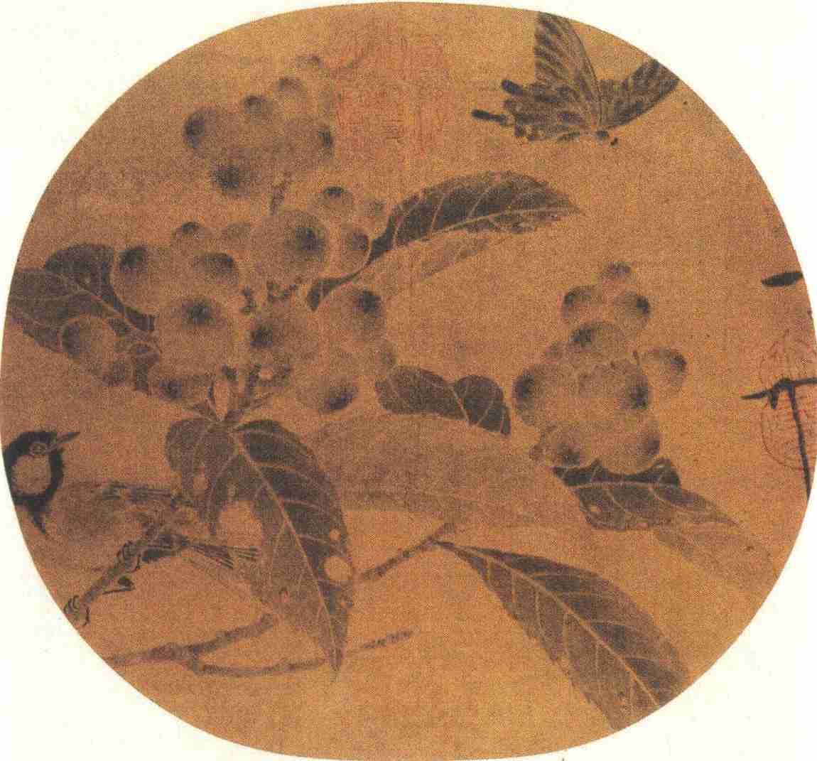 然而,通过写生来做准确的艺术描绘,只是一种手段,它所要最终传达的,是对象的神,即所谓的“以形写神”。图中所展示的是夏季庭院常见小景,在艺术家敏睿眼光的观察下,非常准确、概括地捕捉了这一转瞬即逝的场景。轻盈飞舞的蝴蝶,机警的山鸟,弹性十足的枝干,饱满的果实,仅此一个小小的窗口,就给我们展现了大自然的无限生机。特别值得提出的是蝴蝶和山鸟,形神兼备,呼之欲出,其所达到的艺术水准,令人三叹。而由于扇面形制的特殊要求,画面在剪裁上以少胜多,小中见大,刻意经营,令人无可挑剔。