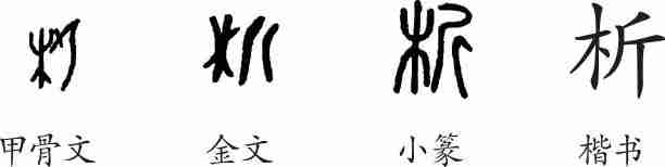 “析”是会意字。甲骨文左边是一棵树,右边是一把长柄斧头,会用斧砍树之意。金文右边的斧形线条化了。小篆进一步线条化。隶变后楷书写作“析”。