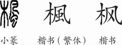 “枫”是形声兼会意字。小篆从木,風声,風兼表摇动之意。隶变后楷书写作“楓”。汉字简化后写作“枫”。