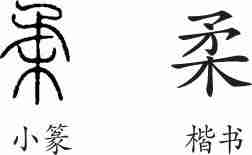 “柔”是会意兼形声字。小篆从木,从矛,矛柄要求有韧性、柔软,故用以会木质柔软之意,矛兼表声。隶变后楷书写作“柔”。