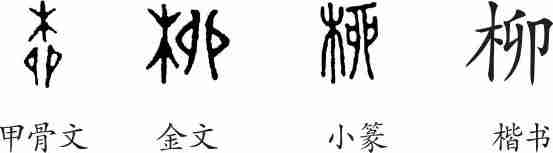 “柳”是形声字。甲骨文从木,卯声。金文大致相同,但木移至左边。小篆整齐化。隶变后楷书写作“柳”。