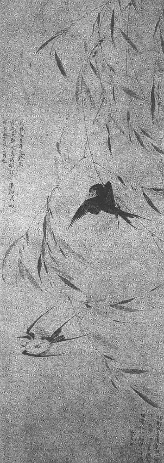 杨柳和燕子,是古代文学家常常用以表达思想感情和形象比喻的生动素材。汉唐以来,在诗歌词曲中,一些骚人墨客借题发挥,因物起兴,曲折隐晦地抒发和寄托他们生活中的悲欢离合。唐人有折柳赠别的习俗,后人因之以为典故。在唐诗宋词中,诗人借咏柳以寄寓离情,或通过形容秋月春风四时朝暮的自然景色,以景寓情,抒发襟怀。燕子在一年中,秋去春来,随季节的变化而迁徙无定,紫燕行踪,牵动着多少旅人的乡思之情。这幅画以柳燕为题,在寥寥数笔中,蕴蓄着澹冶的境趣。
