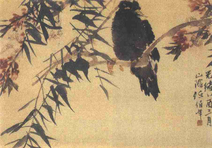 此图为清末海派画家任颐所绘,署款“光绪乙酉三月,山阴任伯年”,知作于光绪十一年(1885),时画家四十六岁。19世纪80年代,正是任颐创作的繁荣时期,题材宽广,数量众多,艺术技巧也趋成熟精湛,其中花鸟画最具个性特色。他的花鸟画早年学北宋“院体”,双勾设色,工笔写实,周密不苟。步入中年,即泛学诸家,曾师清初恽寿平的设色没骨法,写实而又洗练,明丽而又高雅;又法明代陈淳、徐渭的水墨写意法,用笔酣畅,水墨淋漓,更多简逸纵放之韵;后受八大山人影响,造型趋简,带有一挥而就的“速写性”,笔法也由起笔甚重的钉头描变为流润收敛的游丝描;在上海土山湾习素描速写,掌握了西洋画的写生技法,塑形、传神日见准确,笔墨也更加简练、自然。至80年代,遂融汇贯通,运用自如,并以写生为基础,形成兼工带写、清新活泼、明快温馨、奔逸豪宕的“任伯年”画风。此图即反映了他精熟的花鸟画风貌。