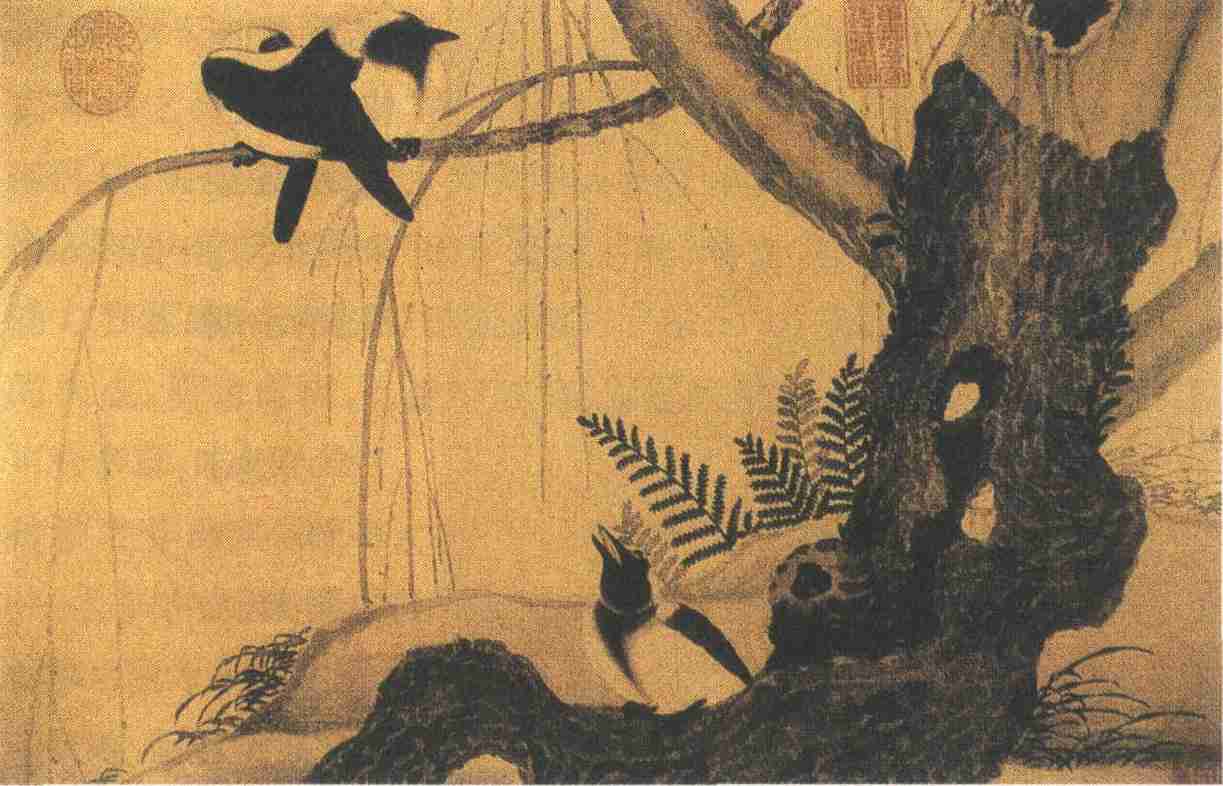 赵佶是北宋末年能书善画的皇帝。传世作品甚多,但“妙体众形”,怕不少出于画院能手的代笔。因为徽宗在朝时,经常在宴会上把御书画分赐群臣,以为乐趣。所以凭他一个人的创作是断难应付的,势必要利用当时画院高手的一些佳作,来充当其数。(见邓椿《画继》)但《柳鸦芦雁图》与这一类传世作品不同,它的运笔用墨以及设色,都带着稚拙的凝重之感,而不属于艳丽工致的类型,所谓“清迥之姿,寓于缣素之上”,与院工精巧制作有所区别。柳鸦一幅中的柳树皮层,用粗笔浓墨作短条皴写,朴质浑厚,凹凸节窾之状,自然天成。柳条直线下垂,流利畅达。其运笔圆润健韧而富有弹性,墨色前后层次分明。停在枝上的三只乌鸦,有两只靠背偎依、静观自得。另一只却和躲在柳树根背后的一只乌鸦喃喃相语。布局错落有致。芦雁一幅,右首画一临湖坡面,上有芦竹数杆,三雁傍水而饮,湖中有蓼花一丛,一雁正昂首啮其近处枝茎,茎干起节处都用粗笔重墨画出,行至茎中部渐淡,很好地表现出蓼花茎干透明的色泽和质感。两图坡岸的傍湖边上,都长着蒲草迎风摇摆。鸦图上有对叶的羊齿草,疏朗地挺立在柳树后坡岸边;雁图有车前草两株,生长在沙坡的水洼边上。一花一草作者都用稳健刻实的笔墨画出,既真实具象而又古拙高雅,真像邓易从的题跋所说:“笔法浑然天成,脱去凡格。浓淡运墨,约略如生。幽静清绝,不可模状。得江南落墨之意韵。”