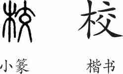“校”是形声兼会意字。小篆从木,从交,表示两木相交制作的刑具(即枷),交兼表声。隶变后楷书写作“校”。
