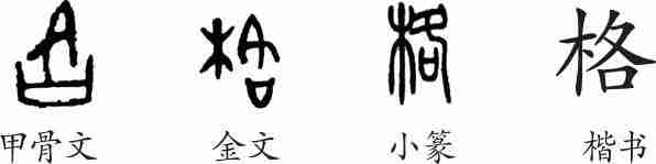 “格”是会意兼形声字。甲骨文像一只脚(倒着的“止”)进门的形状。金文另加义符“木”。小篆从木从各会意,各兼表声。隶变后楷书写作“格”。