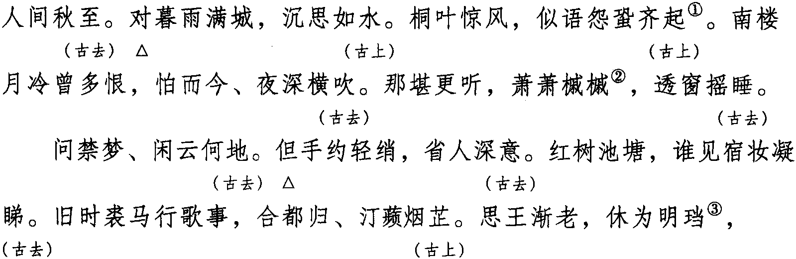 注:一、本词例押古上声“纸” 韵,古去声“寘” “霁” 韵。因 “纸” “寘”“霁” 在现代韵中属“衣”韵,故全调可押衣部“衣”韵。