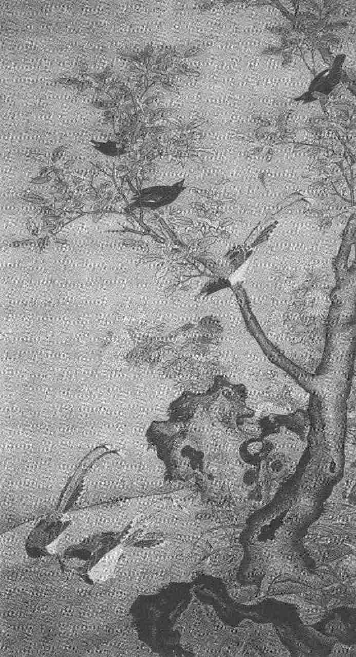 明代画院花鸟画以南宋院体为基础而有所发展,设色浓艳而笔墨健阔。《桂菊山禽图》就是体现了这样的画风。