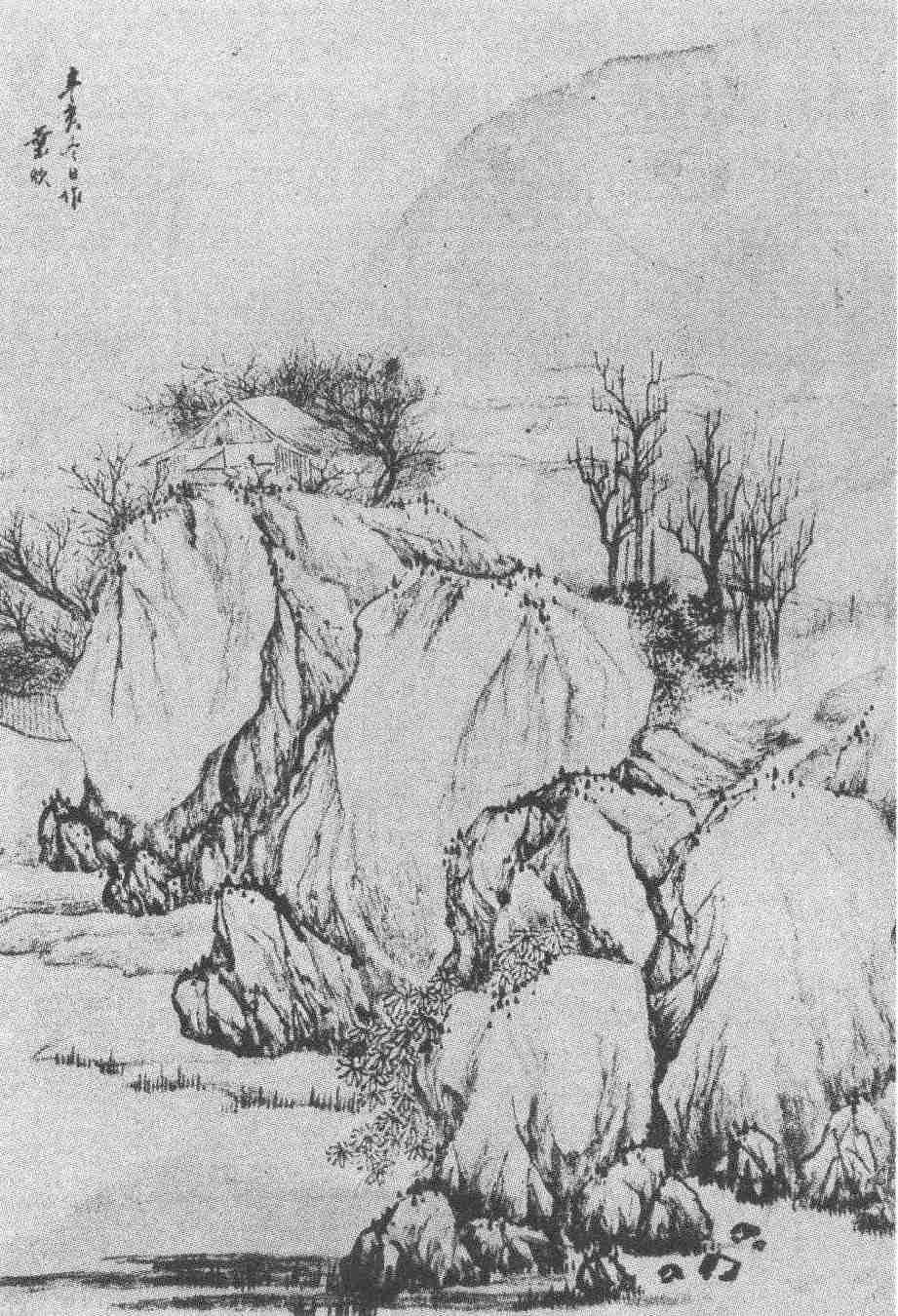 此图描绘高士幽居景象。近景巨岩数重,山质硬峭。岩顶坐落茅屋,一士坐读其中,四周桃花围绕。远景堤泊逶迤,遥山一抹。景色突兀幽僻,富有特色。据画史记载,他的山水以布局见长,其友周亮工在《读画录》卷三中曾评曰:“此老善结构,能就目前所见,一一运之纸,一经其笔,虽极无意物,亦有如许灵异,故往往引入胜地。”这段评论很贴切,也可以作为这幅画的注脚。确实,画中所展现的是很平常的景色,没有什么意想中的佳境,但画家选取了一个很特殊的表现角度,即从巨岩前取景,由近及远,透过几层突兀而起、又硬又厚的岩石,将中心引向高处的茅屋、士人,这样,桃花书屋的题意就显现出来了。同时,在荒僻、空寂而少生气的山林中,点缀了桃花盛开,会使观画者禁不住产生联想,获得“如许灵异”,并“引入胜地”。这种平淡中见奇异的手法,反映了画家独具匠心的构思,也形成了他艺术中的特色。