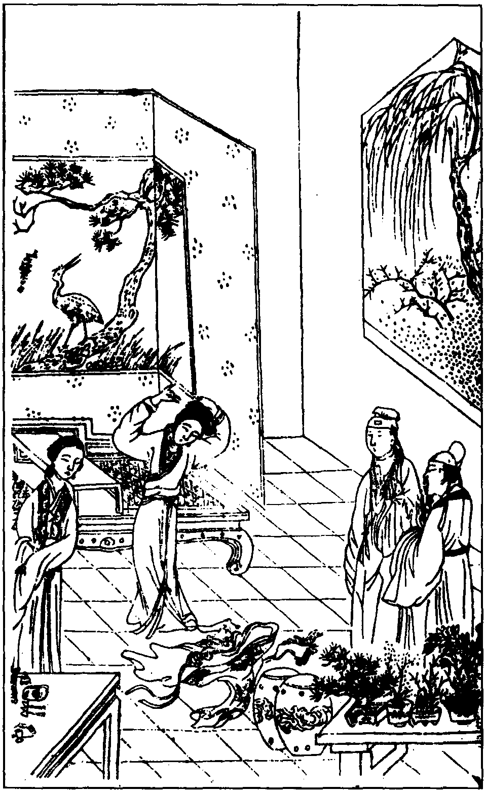 (生看旦介) 俺看香君天姿国色,摘了几朵珠翠,脱去一套绮罗,十分容貌,又添十分,更觉可爱。(小旦) 虽如此说,舍了许多东西,倒底可惜。