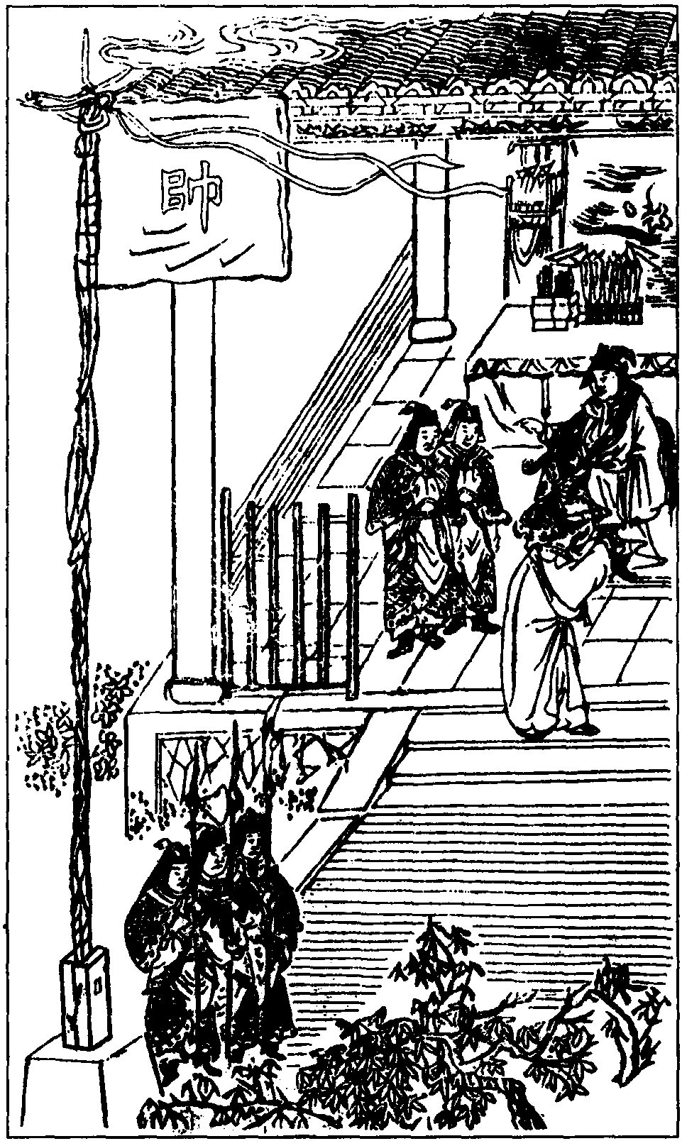 【北雁儿落带得胜令】俺是个不出山老渔樵,那晓得王侯大宾客小。看这长枪大剑列门旗,只当深林密树穿荒草。尽著狐狸纵横虎咆哮,这威风何须要。偏吓俺孤身客无门跑,便作个长揖儿不是骄。(拱介)求饶,军中礼原不晓。(笑介)气也么消,有书函将军仔细瞧。