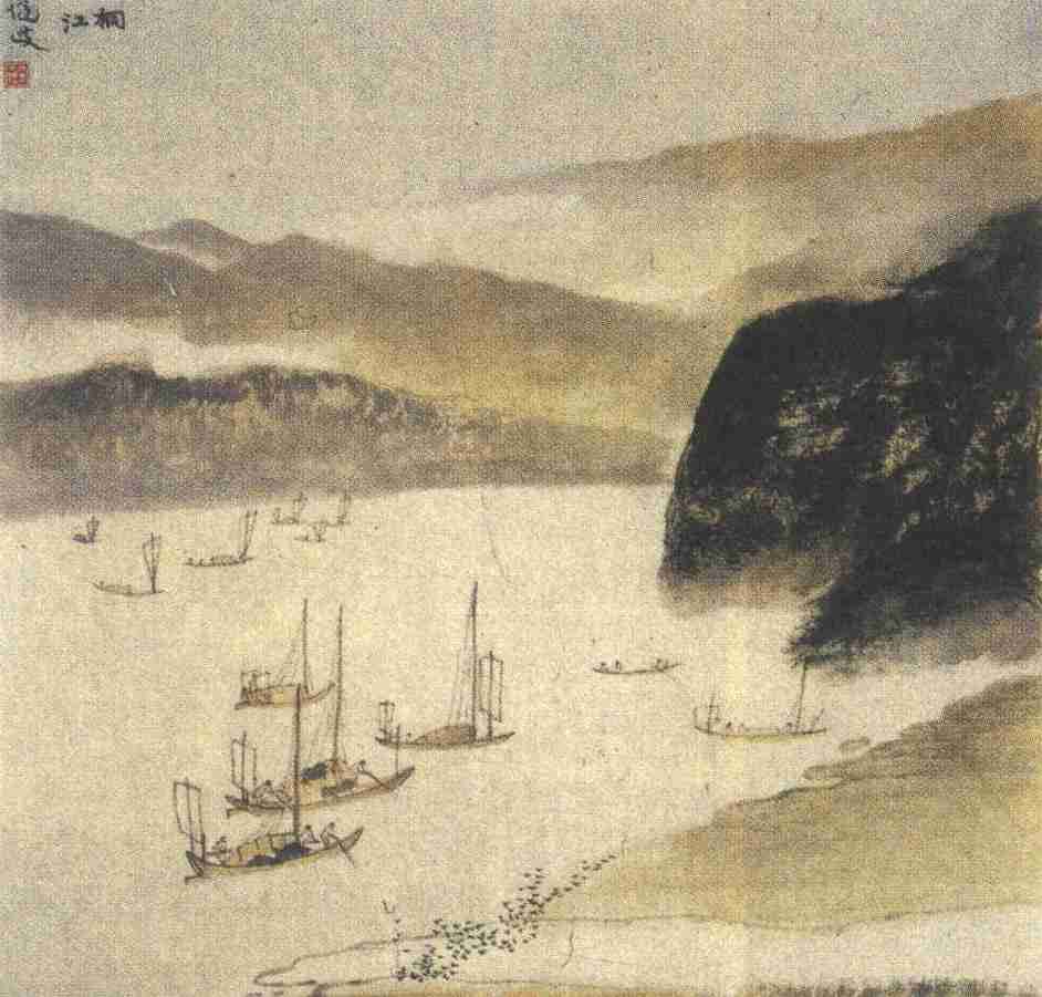 作者把桐江江面画得相当热闹,江上有船十二条,或渔或驶,疏密远近,安排有方,不感拥挤,却大增江面活气。最后还画了一大群江鸟,翱翔聚散于江面浅滩间,平添了一番生趣。