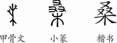 “桑”是象形字。甲骨文上部为树冠,长着桑叶;下部是树根。小篆上部的树枝和桑叶线条化为三个“又”。隶变后楷书写作“桑”。