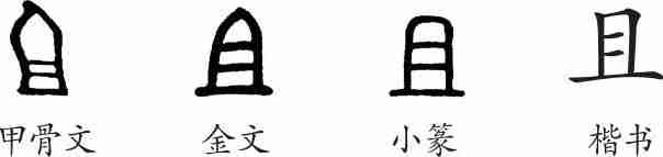 “且”是象形字。甲骨文像雄性生殖器,是初民生殖崇拜的体现。金文和小篆变化不大。隶变后楷书写作“且”。