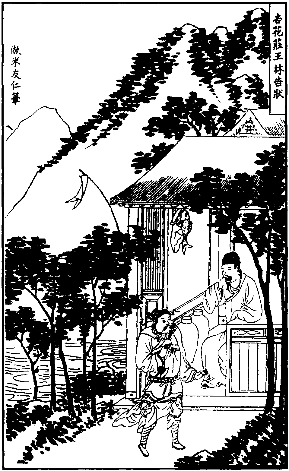 【叨叨令】 那老儿一会家便哭啼啼在那茅店里,他这般急张拘诸的立。那老儿一会家便怒吽吽在那柴门外,(带云) 哭道。我那满堂娇儿也。(唱) 他这般乞留律曲的气。那老儿一会家便闷沉沉在那酒瓮边,他这般迷留没乱的醉。那老儿托着一片席头,便慢腾腾放在土坑上,他这般壹留兀渌的睡。似这般过不的也么哥,似这般过不的也么哥,(宋江云)这厮怎的?(正末唱) 他道俺梁山泊水不甜人不义。