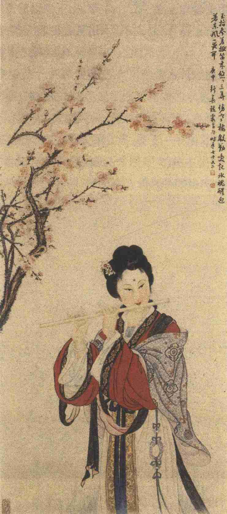 鍊霞所绘仕女,学仇英、唐寅,却具唐人韵致,散藻漓华,典雅绝俗。《梅边吹笛图》作于1980年,是年鍊霞七十二岁,以梅况己,玉笛诉音,有所寄托。图中画一娟秀淑女,曲眉丰颊,云鬓风鬟,红袄霞帔,洒然有林下风。似晨起闲步庭园,行至红梅树畔,明眸凝神,玉笛轻启,吹奏《梅花三弄》,唤醒冰魂,开迎东风。鍊霞善吟哦,上书一绝:“玉指参差启笛来,悠悠三弄伤寒梅。殷勤唤起冰魂醒,迎着东风一夜开。”全图气象高华,景色端丽,图中人物,双眉秋水,十指春葱,窈窕大方,宛然一金闺国士也。此图曾展出多次,迭获佳评。