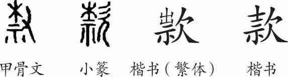 “款”是会意字。甲骨文像人手持木柴在祭台前焚烧祭天之形。小篆整齐化。隶变后楷书写作“”。汉字简化后写作“款”。