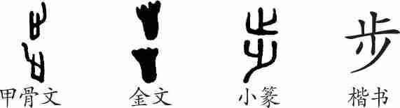 “步”是会意字。甲骨文像左右脚向前走动的样子。金文的形体与甲骨文相似。小篆线条化、整齐化。隶变后楷书写作“步”。