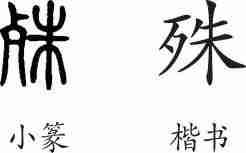 “殊”是形声字。小篆从歹,朱声。隶变后楷书写作“殊”。