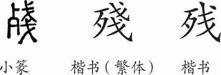“残”是会意兼形声字。小篆从歹(残骨之形),从戔,会残杀之后骨肉细碎之意,戔兼表声。楷书繁体写作“殘”。汉字简化后写作“残”。