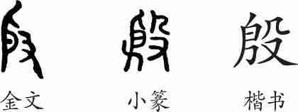 “殷”是会意字。金文左为挺着肚子的人(实为“身”),右为手拿着针往人身上刺,会医治之意。隶变后楷书写作“殷”。