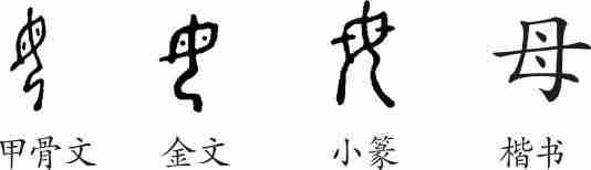 “母”是象形字。甲骨文是面部朝左曲身跪坐的女子。金文的形体与甲骨文基本上一样。小篆由金文演变而来。隶变后楷书写作“母”。