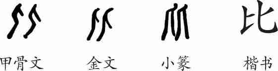 “比”是会意字。甲骨文字形像两人步调一致,比肩而行。金文和小篆都是两个人靠在一块儿的形象,与“从”字同形,只是方向相反。隶变后楷书写作“比”。