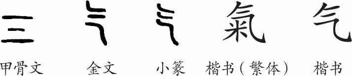 “气”是象形字。甲骨文、金文的形体就像云气蒸腾上升的样子。小篆的形体承接甲骨文、金文。隶变后楷书写作“氣”。汉字简化后写作“气”。