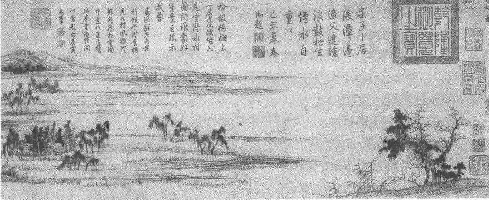 元初赵孟頫是开“元画”一代新风的大家,对后世的影响特别深远。他变易“南宋”画格的《水村图》,正是“元画”“写其意,得其韵”、借景抒情、求得自然神韵的佳构。