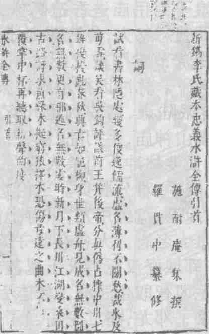 明代白话长篇英雄传奇小说。又名《京本忠义传》、《水浒全传》、《忠义水浒传》、《忠义水浒志传评林》。一百回,亦有一百二十回、一百十五回、七十回等。题“钱塘施耐庵的本,罗贯中编次”,亦题“施耐庵集撰,罗贯中纂修”等。施耐庵,一说名子安,又名肇瑞,字彦端,别号耐庵,元末明初江苏兴化人,后流寓钱塘,卒于淮安;另一说施耐庵是浙江钱塘人,身份类似书会才人,事迹无从查考。罗贯中,名本,字贯中,号湖海散人,元末明初太原人。成书于元末明初。