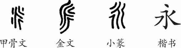 “永”是象形字。甲骨文字形像人在水流中游泳之状。金文字形更像水流。小篆与甲骨文、金文的写法大致相同。隶变后楷书写作“永”。