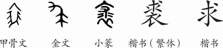 “求”是象形字。甲骨文像一袭毛朝外翻的皮袄。小篆中加了义符“衣”,突出了皮衣之意。“求”为“裘”的古文。